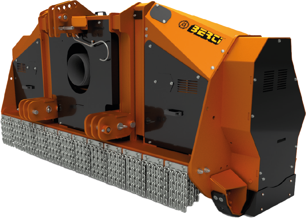 È equipaggiata con attacco a tre punti fisso, doppia cassa in STRENX e HARDOX, cofano posteriore con apertura e chiusura idraulica, slitte regolabili e contromazze avvitate. Dispone di doppio tenditore automatico delle cinghie, doppia trasmissione laterale a cardano e doppi giunti idrodinamici, che consentono un avviamento progressivo e sicuro del rotore e un’ottimale gestione della potenza.
