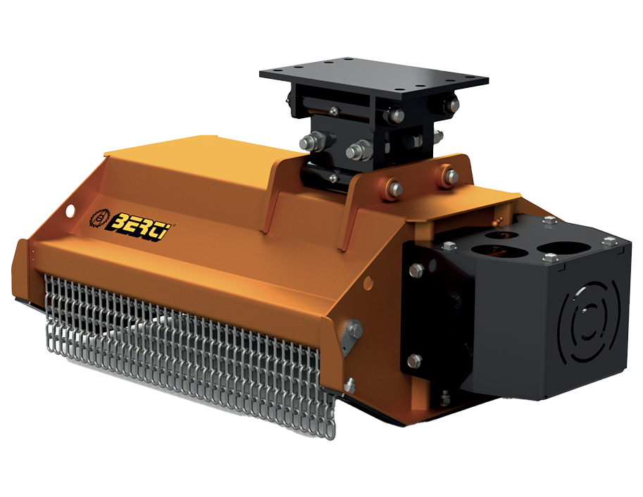 La struttura presenta una doppia cassa in HARDOX e STRENX, che garantisce resistenza elevata all’usura e agli urti. La macchina è dotata di slitte d’appoggio, rullo livellatore, e di un motore idraulico ad ingranaggi in ghisa con drenaggio esterno, gestito tramite il sistema Berti Fluid Box, che ottimizza il flusso dell’olio e protegge l’impianto. Il rotore è equipaggiato con mazze forgiate e bonificate BERTI tipo “G”, progettate per assicurare un taglio efficiente e regolare.